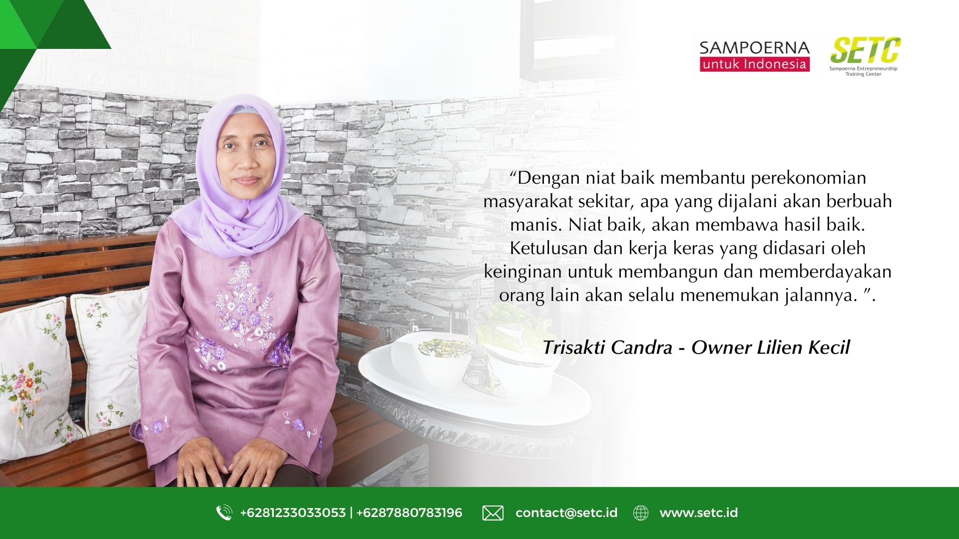 Motivasi membangun usaha tak hanya semata-mata karena motif ekonomi. Trisakti Candradewi membuktikannya. Ia membangun “Lilien Kecil” dengan sebuah harapan besar, yaitu berbagi ilmu, membantu sesama, dan memberdayakan lingkungan sekitarnya. Apa yang dilakukan Candra bersama “Lilien Kecil”-nya? Lilien Kecil adalah brand usaha yang dirintis Candra. Produknya merupakan berbagai kerajinan sulam pita. Dengan kemampuannya menghasilkan kerajinan tangan, Candra berbagi ilmu kepada para tetangganya. Berbagai pelatihan diberikannya, seperti pelatihan menjahit, menyulam, menanam, maupun pemanfaatan barang bekas hingga menjadi produk yang bernilai dan dapat dijual. Ia berharap, dengan ilmu yang dibagikannya, masyarakat di lingkungan sekitarnya bisa lebih berdaya dari sisi ekonomi. Pernah gagal dan membangun “Lilien Kecil” dengan modal Rp 2 juta Lilien Kecil bukan usaha pertama yang dirintis Candra. Sebelumnya, ia pernah gagal saat membangun usaha di bidang kuliner. Meski demikian, ia tak terpuruk. Dengan modal Rp 2 juta yang dikumpulkan dari bekerja di sebuah pabrik, Candra bangkit dan kembali mendirikan usaha dengan produk kerajinan sulam pita “Lilien Kecil”. Produknya berupa mukena, jilbab, taplak meja, hiasan dinding, baju wanita, dan souvenir dengan kekhasan sulam pita dan benang. Berbekal modal yang dimiliki, Candra membeli berbagai bahan sulam menyulam, dan mempekerjakan orang-orang di sekitarnya sebagai pekerja. “Terlalu memaksakan memang, di saat usaha masih awal berdiri dengan modal yang tidak seberapa, saya justru berani mempekerjakan orang lain,” kata Candra. Akan tetapi, dia yakin, dengan niat baik membantu perekonomian masyarakat sekitar, apa yang dijalaninya akan berbuah manis. Niat baik, akan membawa hasil baik. Inilah yang selalu diyakini Candra. Keyakinannya tak salah. Perekonomian para ibu rumah tangga di sekitar kediaman Candra terbantu. “Ada harapan besar di balik Lilien Kecil,” ujar dia. Berkat SETC Menurut Candra, kesuksesan bisnisnya saat ini tak bisa dilepaskan dari peran Sampoerna Entrepreneurship Training Center (SETC). SETC merupakan pusat pelatihan kewirausahaan terpadu sebagai bagian dari tanggung jawab sosial PT HM Sampoerna Tbk. Salah satu tujuannya untuk membangun kapabilitas Usaha Mikro Kecil Menengah (UMKM) di Indonesia. Pada 2010, kisah Candra, salah seorang teman mengajaknya mengikuti pelatihan yang diadakan SETC. Berbagai ilmu didapatkannya melalui pelatihan itu. “Perjalanan bersama SETC membuat saya semakin termotivasi dan memiliki banyak ilmu mengenai wirausaha. Mulai dari menemukan usaha, manajemen, mengelola bahan baku dan karyawan, hingga mengenai riset pasar” kata Candra. Dengan bekal yang didapatkan dari SETC ini pula ia membangun Lilien Kecil pada 2014. Bagi Candra, membangun bisnis memang membutuhkan proses panjang. Banyak hal yang perlu dipelajari dan diketahui, serta berproses tanpa henti. Ia terus menggali potensi diri, melakukan analisis pasar, serta mencoba berbagai peluang usaha. Upaya bertahan di masa pandemi Masa pandemi Covid-19 yang terjadi saat ini menjadi tantangan tersendiri bagi Candra dan para pelaku UMKM lainnya. Selama pandemi, ia sempat mengalami masa tak ada orderan sama sekali karena banyak toko souvenir tutup. Meski demikian, Candra tak patah arang dan berdiam diri. Ia berkreasi dengan memproduksi masker dan tetap menampilkan kekhasan produknya yaitu sulam pita dan benang. Pada masa pandemi ini, masker merupakan salah satu kebutuhan utama masyarakat dalam beraktivitas sehari-hari. Hal ini pun menjadi peluang usaha baru. Ternyata, produk ini banyak peminat dan membuat usahanya bisa bertahan. Selain itu, Candra juga mengikuti program lainnya yang diadakan SETC terkait tanaman obat. “Peran SETC pada saat pandemi, salah satunya melalui program Ada dan Andalan SETC, Budi Daya Tanaman Obat Keluarga,” kata Candra. Ia mengatakan, awalnya mengikuti kegiatan ini karena keinginan menjaga kesehatan keluarga dengan tanaman obat. Tanaman obat itu diolah menjadi berbagai produk olahan dengan tetap mengusung brand Lilien Kecil. “Namun, tidak berhenti begitu saja. Kegiatan budi daya tanaman obat keluarga juga saya tularkan kepada tetangga,” ujar Candra. Sumber: DetikFinance. 2022. Harapan Besar Candra di Balik “Lilien Kecil”. https://finance.detik.com/solusiukm/d-5997199/harapan-besar-candra-di-balik-lilien-kecil