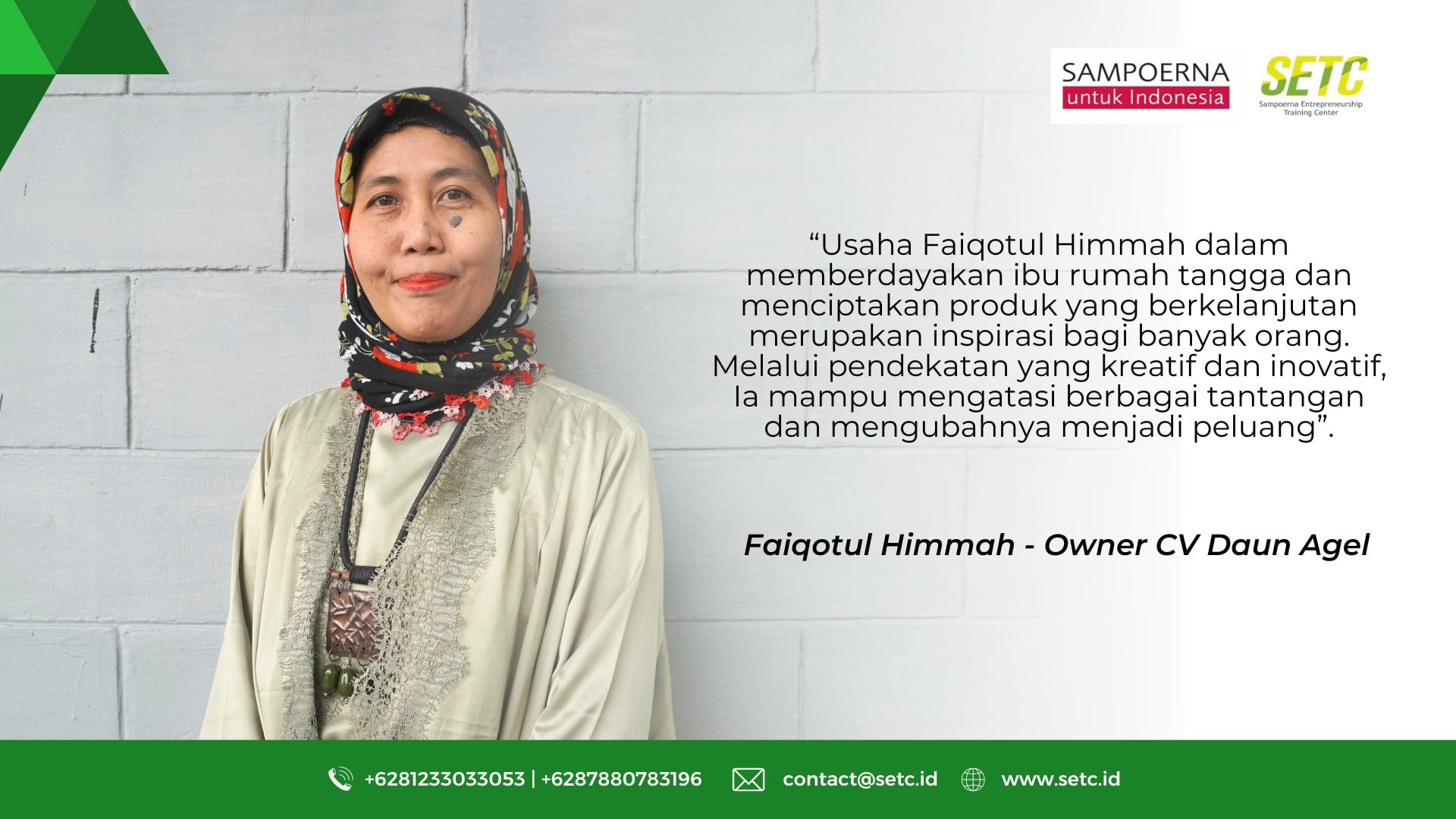 Berawal dari program pelatihan rajut bagi ibu-ibu di Kecamatan Sepulu, Bangkalan, yang merupakan pengungsi kerusuhan Sambas, Kalimantan Barat, Faiqotul Himmah memutuskan untuk menjadi relawan sekaligus ketua kelompok. Ia melatih 10-15 orang, sebagian besar peserta adalah ibu-ibu dan janda yang terdampak kerusuhan pada tahun 1999. Kebanyakan dari mereka belum memiliki dasar dalam merajut, sehingga pelatihan dimulai dari nol. Pelatihan ini bertujuan untuk memberikan keterampilan baru yang dapat digunakan oleh para ibu rumah tangga untuk mendapatkan penghasilan tambahan. Namun, perjalanan ini tidak mudah. Faiqotul Himmah menemukan kendala dalam mendapatkan bahan baku benang. Untuk mendapatkan bahan baku, ia harus membeli ke kota yang berjarak 10 km dari tempat tinggalnya. Dalam kondisi ini, ia harus kreatif dan inovatif untuk mencari alternatif bahan baku. Ia kemudian menemukan daun palem, yang biasa tumbuh di daerahnya dan digunakan sebagai tali untuk sapi, kapal, dan pecut. Dengan bahan baku ini, Faiqotul Himmah mulai mengeksplorasi potensi daun palem untuk dijadikan produk kerajinan. Tekadnya untuk menekuni wirausaha semakin kuat, dan pada tahun 2008, ia mendirikan CV Daun Agel. Produk-produk yang awalnya hanya dipasarkan di pasar kecil kini telah menembus pasar internasional, termasuk Amerika, Kolombia, Jepang, hingga Prancis. Perjalanan usaha ini tidak lepas dari kerja keras dan dedikasi Faiqotul Himmah. Dalam sebulan, ia mampu memproduksi 300-500 produk berupa tas, topi, dan karpet, dengan omzet 200-300 juta rupiah per bulan. Saat ini, CV Daun Agel telah melibatkan sekitar 20-50 orang pekerja, mulai dari penyediaan bahan baku, pembuatan desain, menjahit, hingga merajut. Hal ini menunjukkan bahwa usaha yang dimulai dengan sederhana dapat berkembang menjadi besar dengan ketekunan dan inovasi. Peran SETC Usaha Faiqotul Himmah dalam memberdayakan ibu rumah tangga dan menciptakan produk yang berkelanjutan merupakan inspirasi bagi banyak orang. Melalui pendekatan yang kreatif dan inovatif, ia mampu mengatasi berbagai tantangan dan mengubahnya menjadi peluang. Dukungan dari SETC juga menunjukkan betapa pentingnya pelatihan dan jaringan dalam mengembangkan UMKM. Faiqotul Himmah bertekad untuk terus mengembangkan usahanya dan membantu lebih banyak orang di komunitasnya. Dengan semangat sociopreneurship, ia berharap dapat menciptakan lebih banyak lapangan kerja dan memberikan dampak positif yang lebih luas. Sejak bergabung dengan SETC pada tahun 2018, Faiqotul Himmah mendapatkan banyak manfaat, termasuk jaringan yang lebih luas, pameran, dan pelatihan bersama UMKM lainnya. SETC telah memberikan pelatihan penting seperti fotografi produk, penggunaan media sosial untuk pemasaran, dan banyak lagi. Ini sangat membantu dalam meningkatkan kualitas dan jangkauan pemasaran produk Daun Agel. Selain itu, bergabung dengan SETC dan komunitas UMKM SUI-SETC, dapat memperluas jejaring, sehingga juga memberikan dampak positif pada komunitas yang ia bina. “Saya turut senang membantu ibu-ibu rumah tangga yang dulunya belum memiliki pendapatan, sekarang mampu mengembangkan perekonomian keluarganya” tutup Faiqotul Himmah. Daun Agel menjadi contoh nyata dari perjalanan sociopreneurship, di mana usaha tidak hanya berfokus pada keuntungan finansial tetapi juga memberikan kontribusi sosial yang signifikan. SETC Community HUB SETC Community Hub adalah platform kolaboratif yang berfungsi sebagai pusat ekosistem untuk meningkatkan kondisi sosial ekonomi melalui pembinaan, akses sumber daya, kolaborasi, akses pasar, serta inovasi digital, dengan menghubungkan pelaku UMKM dengan pemangku kepentingan seperti pemerintah, asosiasi hingga komunitas bisnis lainnya. SETC Community Hub tersebar di seluruh Indonesia. Program-program yang dikembangkan di SETC Community Hub mencakup pelatihan intensif, inkubasi bisnis, dan business matching untuk menghubungkan UMKM dengan calon mitra bisnis potensial. Selain itu, juga diselenggarakan pameran untuk meningkatkan visibilitas dan jaringan pemasaran UMKM. Semua inisiatif ini bertujuan menciptakan ekosistem yang mendukung dan memberdayakan UMKM agar mereka dapat tumbuh dan berkembang secara berkelanjutan. Yuk bergabung menjadi bagian dari perjalanan SETC Community Hub untuk mendukung pemberdayaan masyarakat. Melalui dukungan kita terhadap usaha lokal, kita juga turut membangun perekonomian Indonesia.